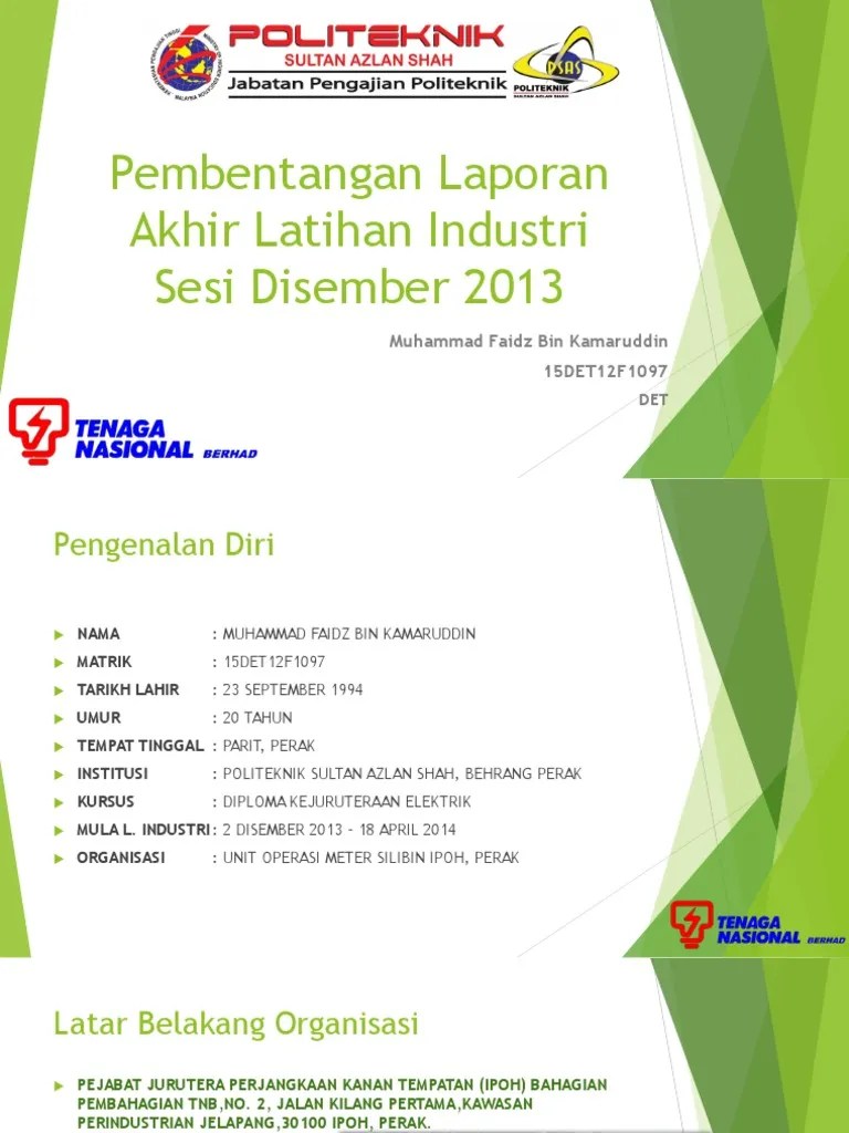Sebagainya adalah salah satu contoh medium komunikasi tersebut. Memperbanyakkan aktiviti luar kepada pelajar · mengadakan lawatan ke tempat/agensi yang berkaitan dengan bidang yang diambil oleh pelajar · meningkatkan kemahiran . Polytechnic ibrahim sultan, johor bahru panasonic avc networks pasir gudang, malaysia diploma in electronics . Khas kepada pelajar politeknik malaysia yang sedang menjalani latihan industri. By muhd_paeh in types > presentations. Hajar hafizah binti mohamad nazali no. You have just read the article entitled contoh slide pembentangan latihan industri. 2,129 views jul 15, 2021 name : Text of (slide show) pembentangan laporan akhir latihan industri. Khas kepada pelajar politeknik malaysia yang sedang menjalani latihan industri.
